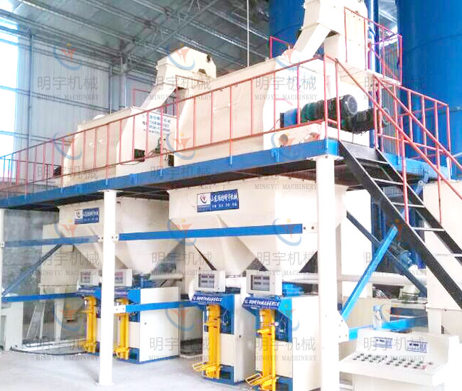 該設(shè)備主要由加料斗、斗式提升機(jī)、臥式無(wú)重力攪拌機(jī)、成品倉(cāng)、自動(dòng)稱量包裝機(jī)、電控箱、平臺(tái)、支架、除塵器組成。 工人根據(jù)配比將原料依次投入加料斗內(nèi),由斗式提升機(jī)將物料提升至臥式無(wú)重力攪拌機(jī),混合2-3分鐘(根據(jù)不同物料混合時(shí)間略有差別)?;旌虾玫奈锪弦揽孔陨碇亓β渲脸善穫}(cāng),成品倉(cāng)下部配全自動(dòng)稱量包裝機(jī),將混合好的成品裝袋包裝。在包裝過(guò)程中,可以重復(fù)上面投料、提升、攪拌等過(guò)程,以實(shí)現(xiàn)流水線作業(yè),提供生產(chǎn)效率。